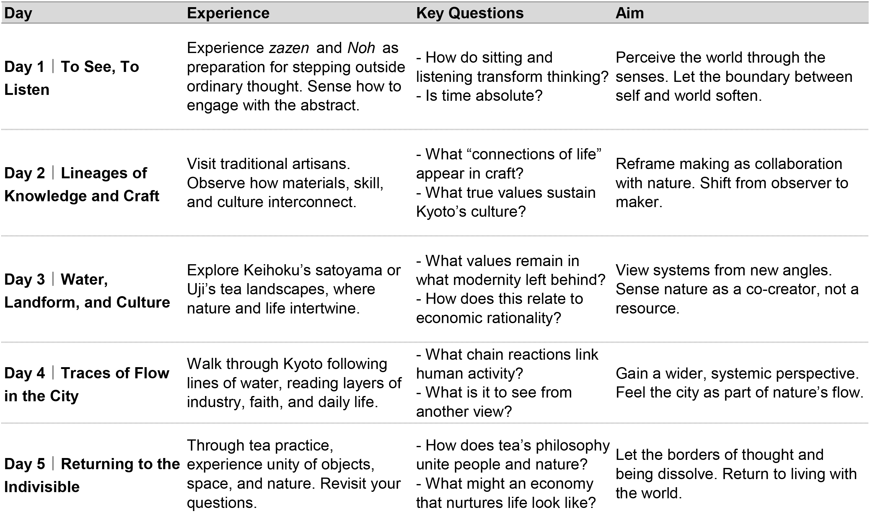 Using water as a guide, this program explores the cultural structures behind Kyoto’s forests, cityscape, and material flows. By engaging with the wisdom of those who have carried forward its craft and cultural traditions, participants are invited to loosen the fixed perspectives of modern society—and cultivate new ways of seeing through a journey only PERSPECTIVE can offer.